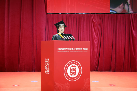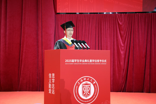 “四年前,我以为理工科只有冰冷的公式,直到导师深夜实验室的灯照亮了数据模型的温度。”中国国际大学生创新大赛(2024)金奖、首届全国大学生职业规划大赛铜奖获得者光电学院本科生石悦言作为毕业生代表,分享从“代码报错手忙脚乱”到带领团队斩获创新创业项目的蜕变,她以“理工的浪漫是于混沌中寻找秩序”诠释上理“信义勤爱 思学志远”的校训精神。