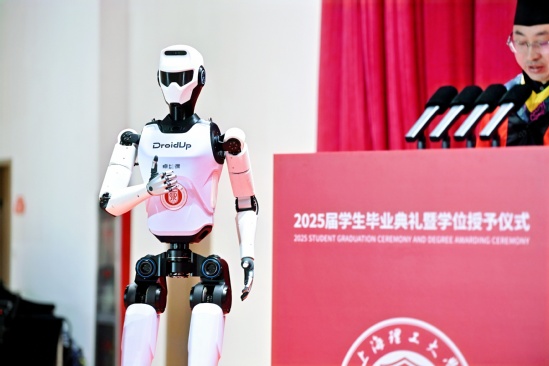 典礼现场,健康学院教师代表李清都带来了一份特别的“礼物”——“行者二号”机器人,它以独特的方式向即将踏上人生新征程的毕业生们“打招呼”,成为典礼上最令人瞩目的科技亮点。他回顾起与同学们并肩作战的日夜,“当‘行者二号’在全球首个人形机器人半程马拉松赛中拿下季军,在国际全地形挑战赛勇夺冠军时,机械腿摆动的轨迹里,藏着你们多少个凌晨时光调试代码的执着;仿生关节的震颤中,凝结着你们上百次推翻设计的勇气。这些成绩不仅仅是一次次技术的突破,更像一场特殊的‘人生马拉松’预演。”面对即将启程的毕业生,李清都老师以“半杯哲学”为寄语,希望毕业生们看自己时多看到未填满的可能,看他人时多发现半杯满的光芒,以勤奋完善自我,以乐观拥抱时代,以包容影响世界。