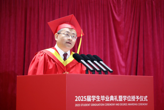 “当‘行者二号’在全球首个人形机器人半程马拉松赛中拿下季军,在国际全地形挑战赛勇夺冠军时,机械腿摆动的轨迹里,藏着你们多少个凌晨时光调试代码的执着;仿生关节的震颤中,凝结着你们上百次推翻设计的勇气。这些成绩不仅仅是一次次技术的突破,更像一场特殊的‘人生马拉松’预演。”面对即将启程的毕业生,李清都以“半杯哲学”为寄语,希望毕业生们看自己时多看到未填满的可能,看他人时多发现半杯满的光芒,以勤奋完善自我,以乐观拥抱时代,以包容影响世界。