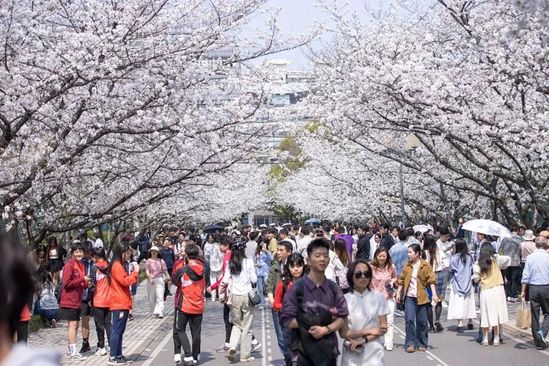每年四月,是同济大学最浪漫的时刻,校园内的樱花大道化身粉樱花海,美不胜收。樱花树下,同学们争相打卡留念。
