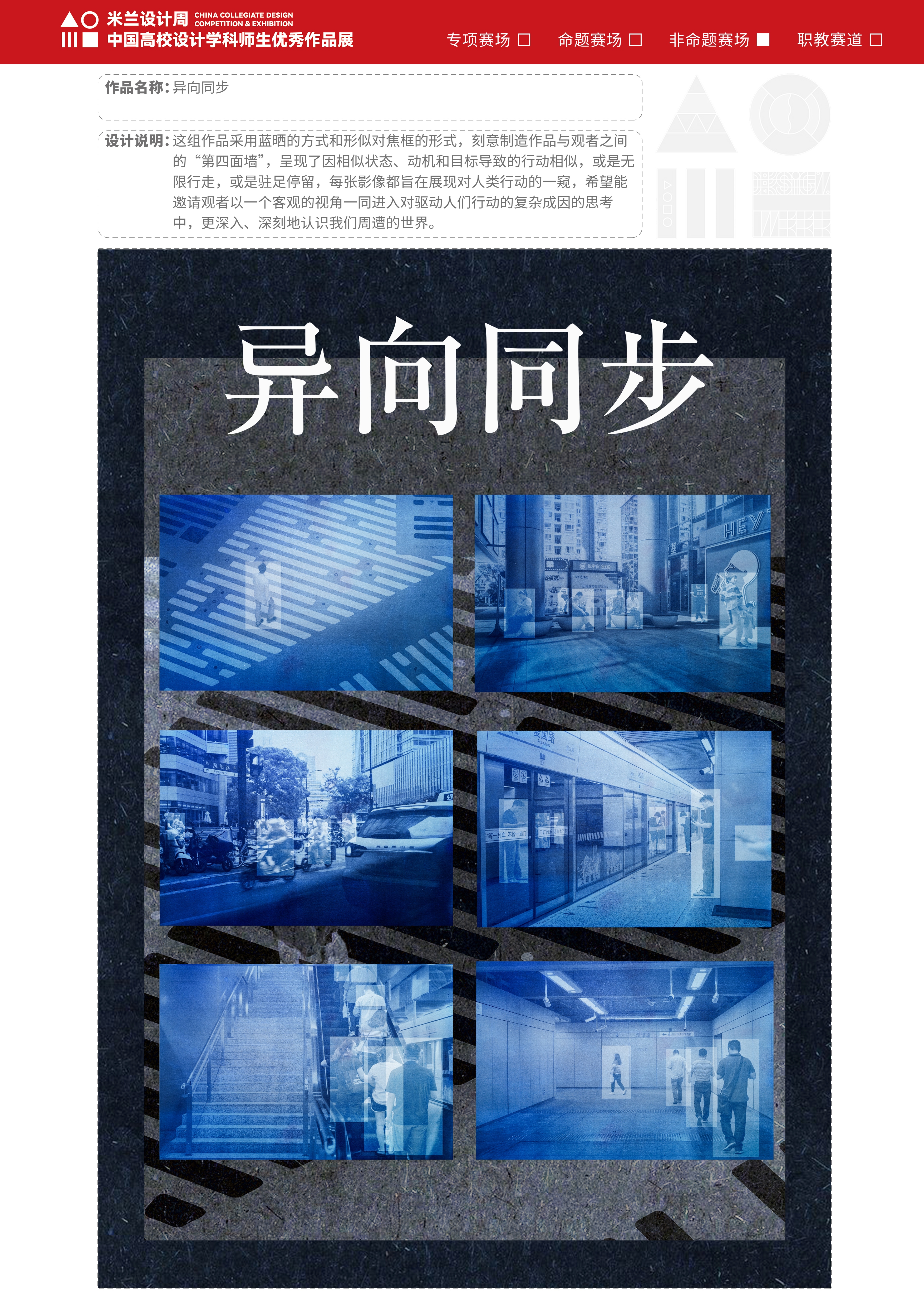 作品说明:这组作品采用蓝晒的方式和形似对焦框的形式,刻意制造作品与观者之间的“第四面墙”,呈现了因相似状态、动机和目标导致的行动相似,或是无限行走,或是驻足停留,每张影像都旨在展现对人类行动的一窥,希望能邀请观者以一个客观的视角一同进入对驱动人们行动的复杂成因的思考中,更深入、深刻地认识我们周遭的世界。