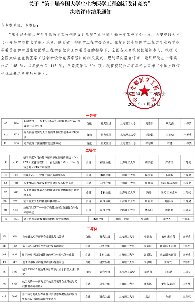我院10支队伍,20余名学子在副院长胥义和生物医学工程系严荣国、谷雪莲带领下,应邀参加这场学术与创新的盛宴,在BME最高的赛场绽放上理工的青春风采。上理学子共斩获得全国一等奖3项(研究生组)、二等奖7项(研究生组4项、本科生组3项)、三等奖7项(研究生组6项、本科生组1项)。其中,由蔡文杰副教授指导的 “心龄智探——基于AL-ECG 的年龄预测与生活习性分析一体化平台”项目勇夺医工AI赛道全国第一,并在闭幕式上王嘉豪代表团队进行了3分钟的创新历程分享。