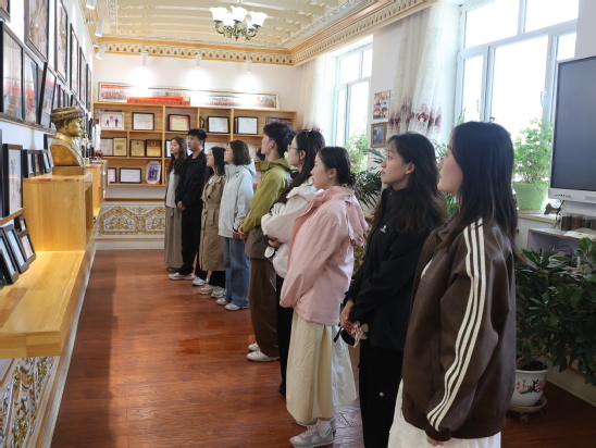 泛黄的巡逻日志、磨旧的护边马靴、定格着笑容的老照片…… 7月19日,研学团师生走进拉齐尼・巴依卡纪念馆。在一幅幅珍贵影像与一件件实物展品间,“帕米尔雄鹰”用生命守护家国的赤子情怀感动了每一位在场师生。展厅墙上,“这辈子要一直做守护边疆的雄鹰” 的誓言被郑重镌刻,师生们驻足良久,静静聆听着拉齐尼一家三代戍边护边的故事:从祖父协助边防战士踏遍雪山峡谷,到父亲在暴风雪中为巡逻队引路,再到拉齐尼冒死救助冰窟孩童、最终用生命践行护疆承诺。这是刻进基因的家国挚爱,是融入血脉的民族团结坚守。“他用生命告诉我们,爱国从不是抽象的口号,而是危难时挺身而出的担当。”学生王婕晔的感慨,道出了在场所有人的心声。