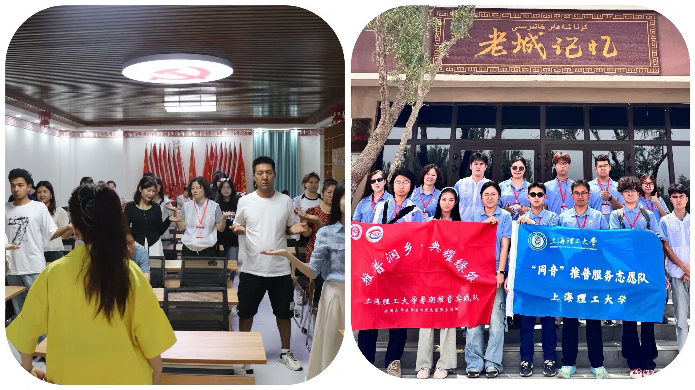 当绕口令的清音穿透乡村课堂,当漆扇的彩墨晕染戈壁热浪,当木卡姆的琴弦震颤大漠长风——由教务处牵头组队的"推普润乡·典耀绿筑"推普实践团在这个7月跨越山河,奔赴新疆莎车县以语言为舟,以文化为桨,开启了一场贯通古今、连接沪疆的壮美航行。普通话的清泉浇灌边疆热土,青春之光在非遗瑰宝与学术智慧中交相辉映。