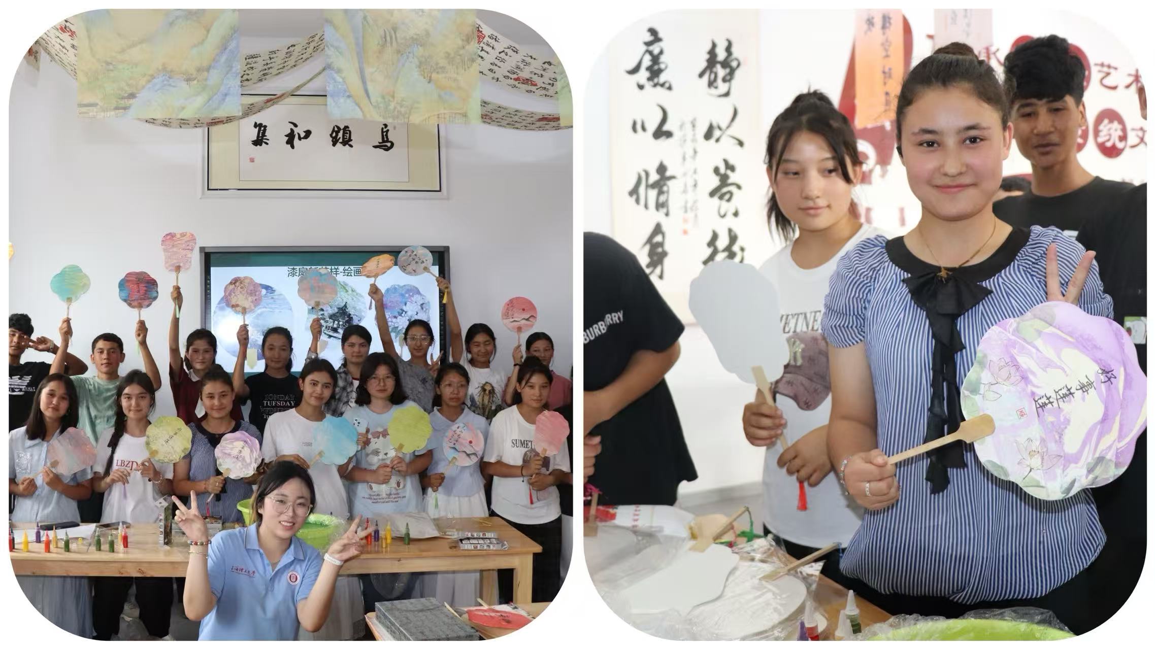 为传播中华传统文化,感受传统美学底蕴,志愿者团队在乌达力克镇举办了漆扇活动,为当地学子带来了一段沉浸式的触摸非遗文化体验。“朱砂红像帕米尔高原西沉的落日,青黛色是江南烟雨中的朦胧远山。”志愿者一边讲解,一边示范着浸染技法。当15 岁的阿孜古丽屏住呼吸,缓缓提起自己手中的扇面,惊喜地喊道:“这朵花,和妈妈艾德莱斯绸上的图案好像呀!”文化的共鸣、民族间的理解与交融便在这欢声笑语中悄然间生根。