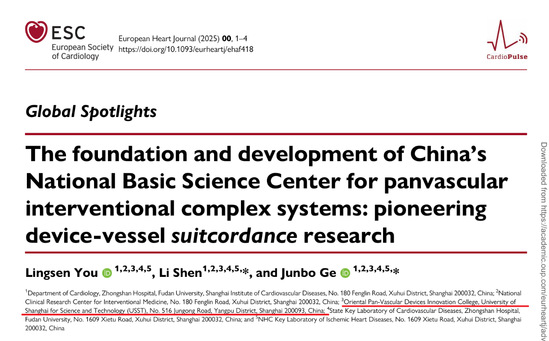 近日,葛均波院士团队在国际顶级期刊《欧洲心脏杂志》(European Heart Journal,中科院一区TOP,影响因子35.6)发表了题为《国家基金委泛血管介入复杂系统基础科学中心的建立与发展:开创器械-血管三大生态平衡与配和度研究》(The foundation and development of China’s National Basic Science Center for panvascular interventional complex systems: pioneering device-vessel suitcordance research)的重要研究成果。永利集团304am官方入口东方泛血管器械创新学院参与了该项研究,学院院务委员会主任葛均波院士、学院院务委员会委员沈雳教授为通讯作者。