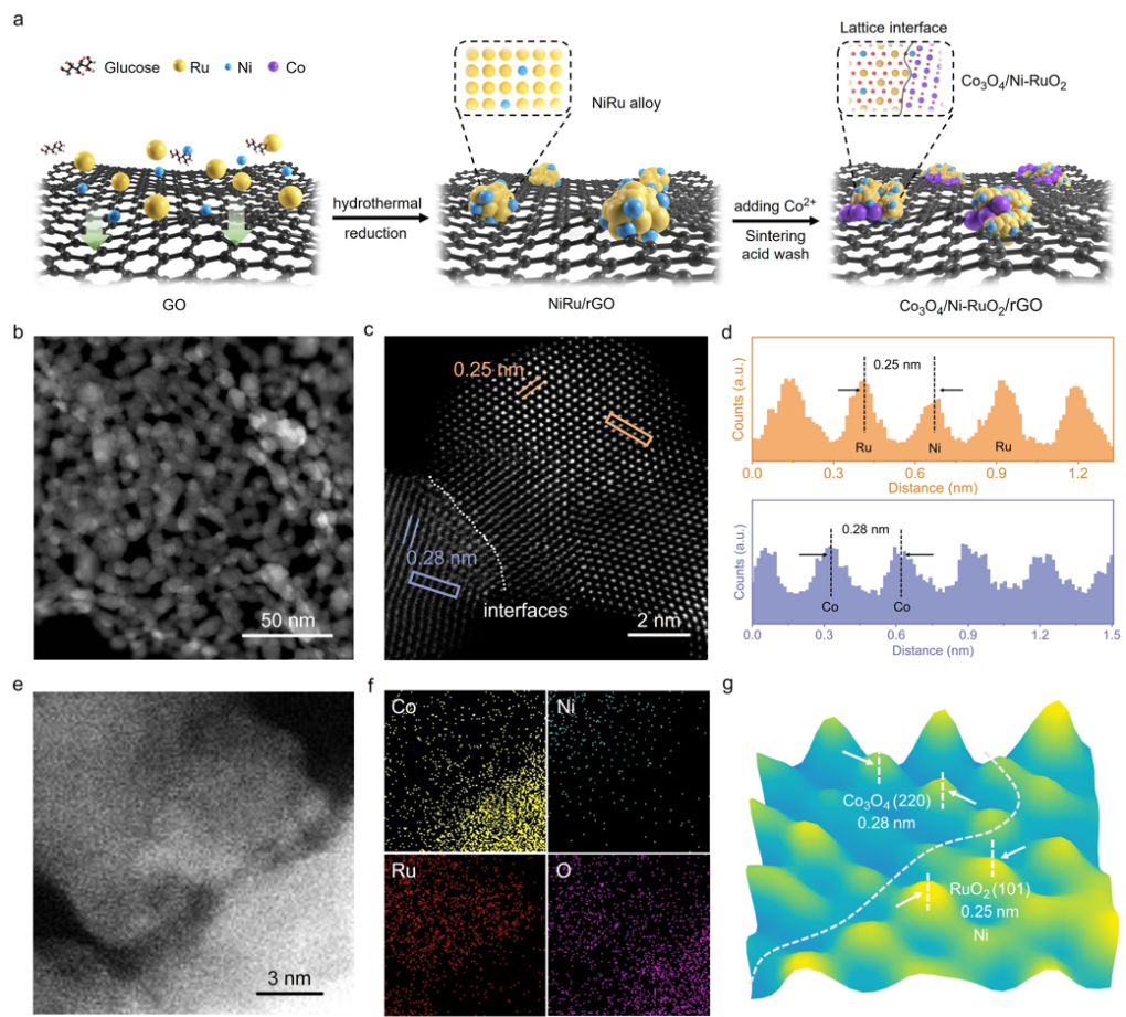 针对以上难题,杨伟伟等带领研究生刘鑫洋、王志军和雷鹄旭等创新性地采用以下方案:一是利用纳米胶岛效应,通过原位定向生长技术实现单原子铂在氧化铈胶岛表面局部密度的有效调控;二是采用价格相对低廉的钌(US$8,090/kg)代替铂,通过硼和氧双原子实现钌配位环境的有效调控与电子转移;三是通过镍原子掺杂二氧化钌和氧化钴作为牺牲剂的策略,提高催化剂产氢效率的同时,有效抑制了二氧化钌的氧化溶解。
