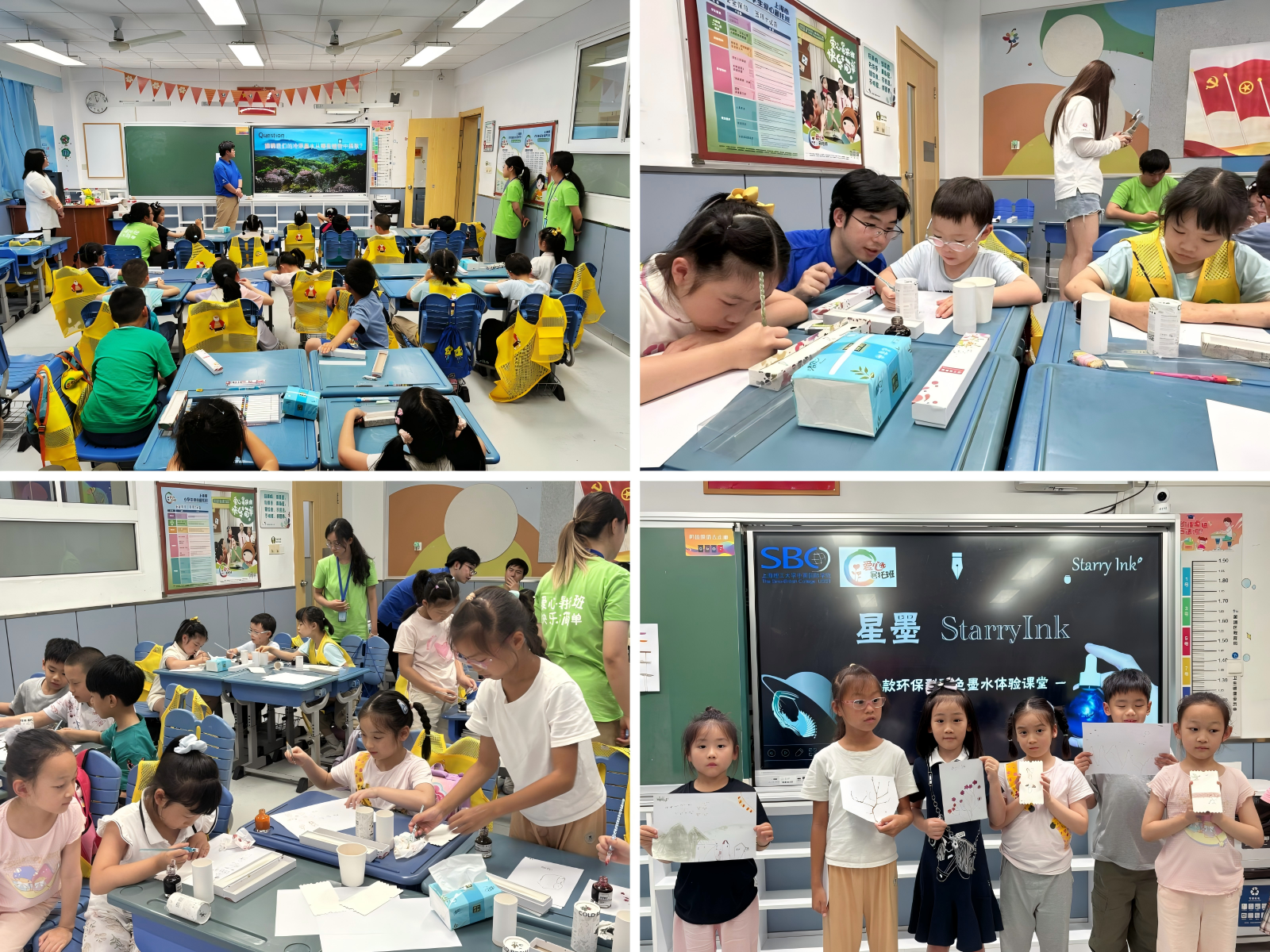 7月7日、17日、29日及8月14日,中英国际学院的老师、创新领导力中心的学生们及星墨科创团队成员组成科创讲师团,在雁荡路七色花小学开展了主题为“星墨:环保彩色墨水课堂”的研学活动,为瑞金二路街道暑托班二至五年级的孩子们,带来了一场融合美育与科创的奇妙体验。课堂从“墨水的前世今生”娓娓道来,通过课件展示、视频讲解、互动提问等丰富形式,帮助孩子们学习色彩的原理,了解墨水的起源。实践环节,天然植物制成的安全环保彩色墨水变身为教具,孩子们化身“小小画家”,尝试使用玻璃笔和彩色墨水创作画作,在动手实践中感受科技与艺术的交融。“原来墨水可以这么环保又漂亮!”一位三年级学生在完成作品后兴奋地说道。孩子们在一片欢声笑语中增长本领见识,启蒙科创思维。