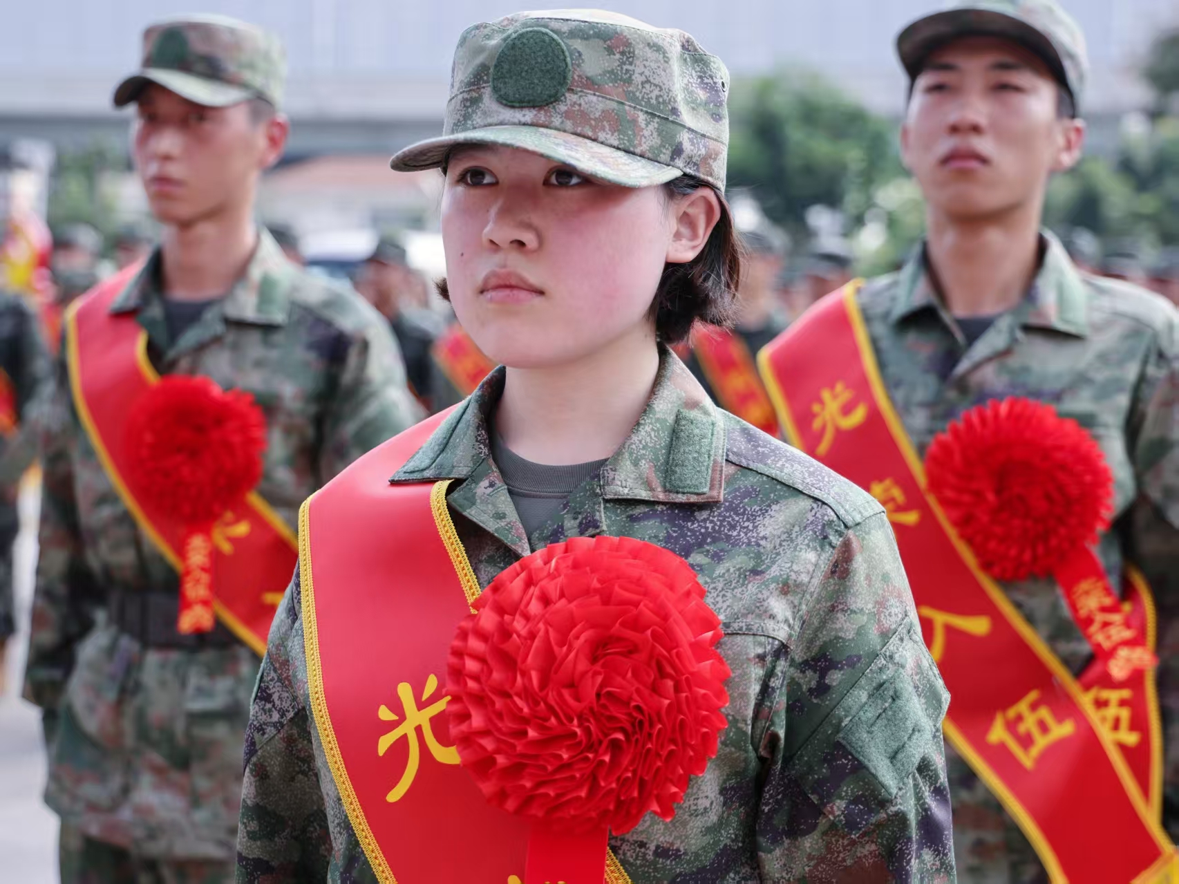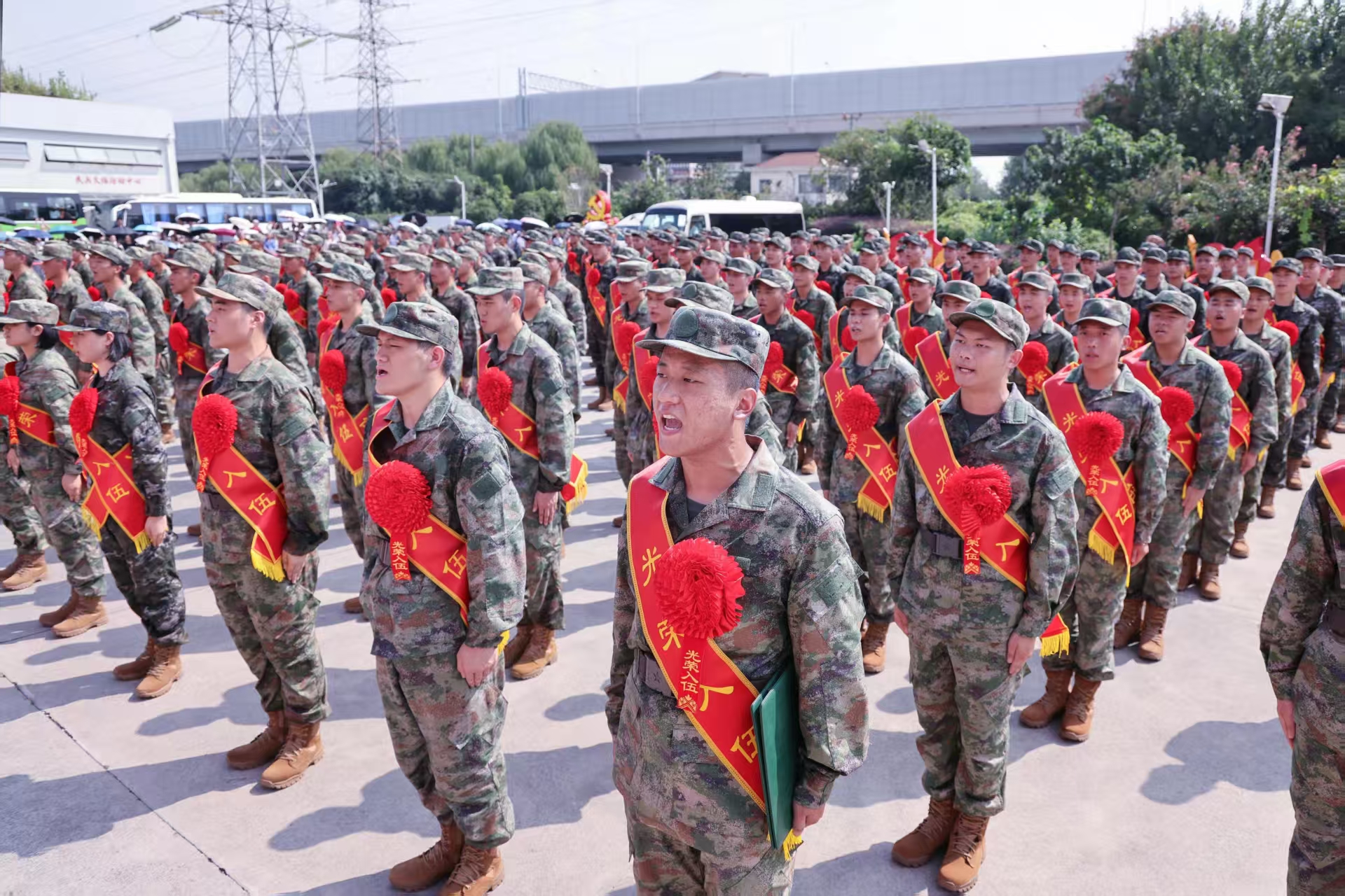 在《中国人民解放军军歌》慷慨激昂的歌声中,身着戎装、胸戴红花的热血青年们精神抖擞、意气风发,怀着对军营生活的向往和对保家卫国的坚定信念,开启崭新的军旅生涯。