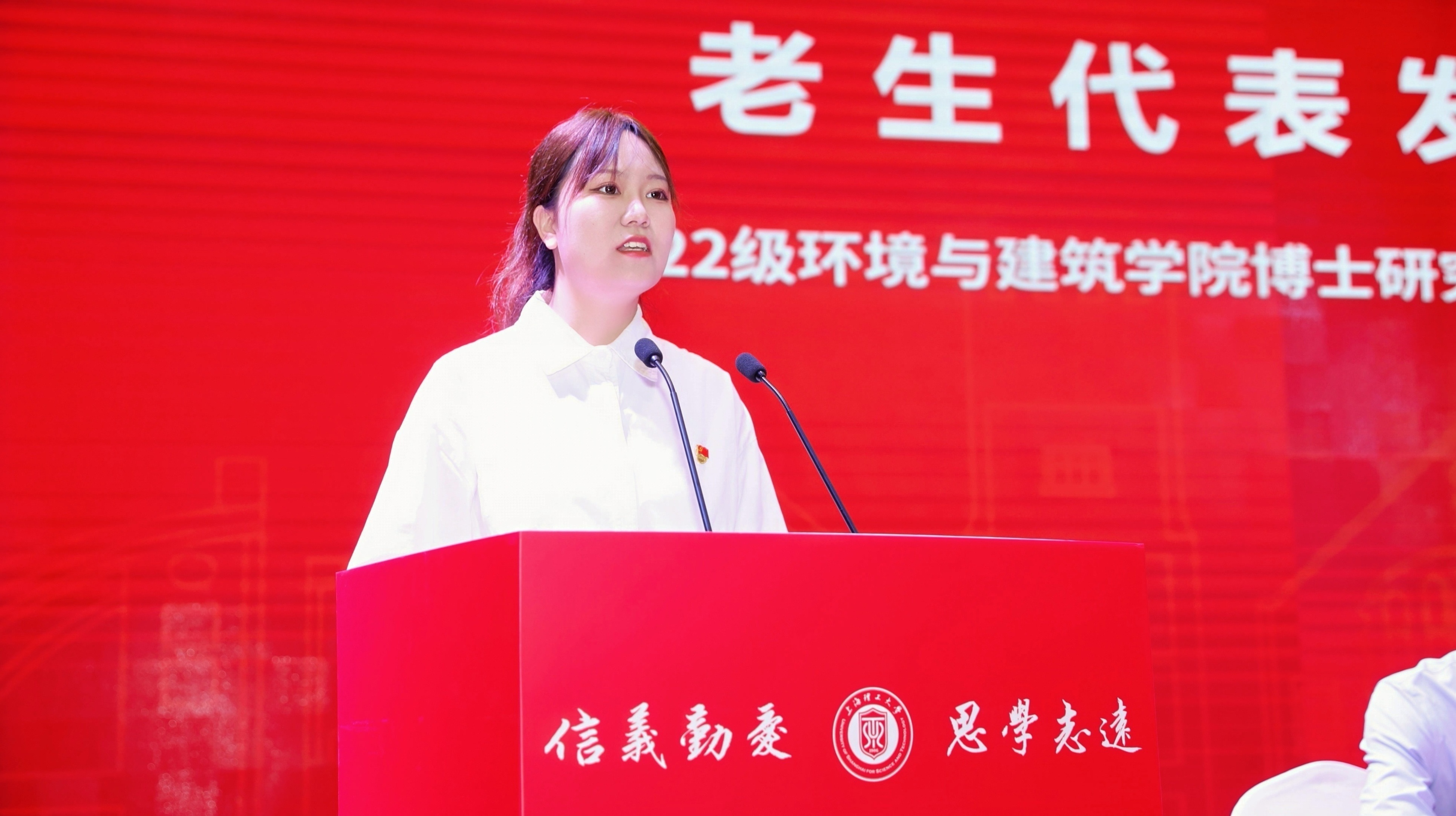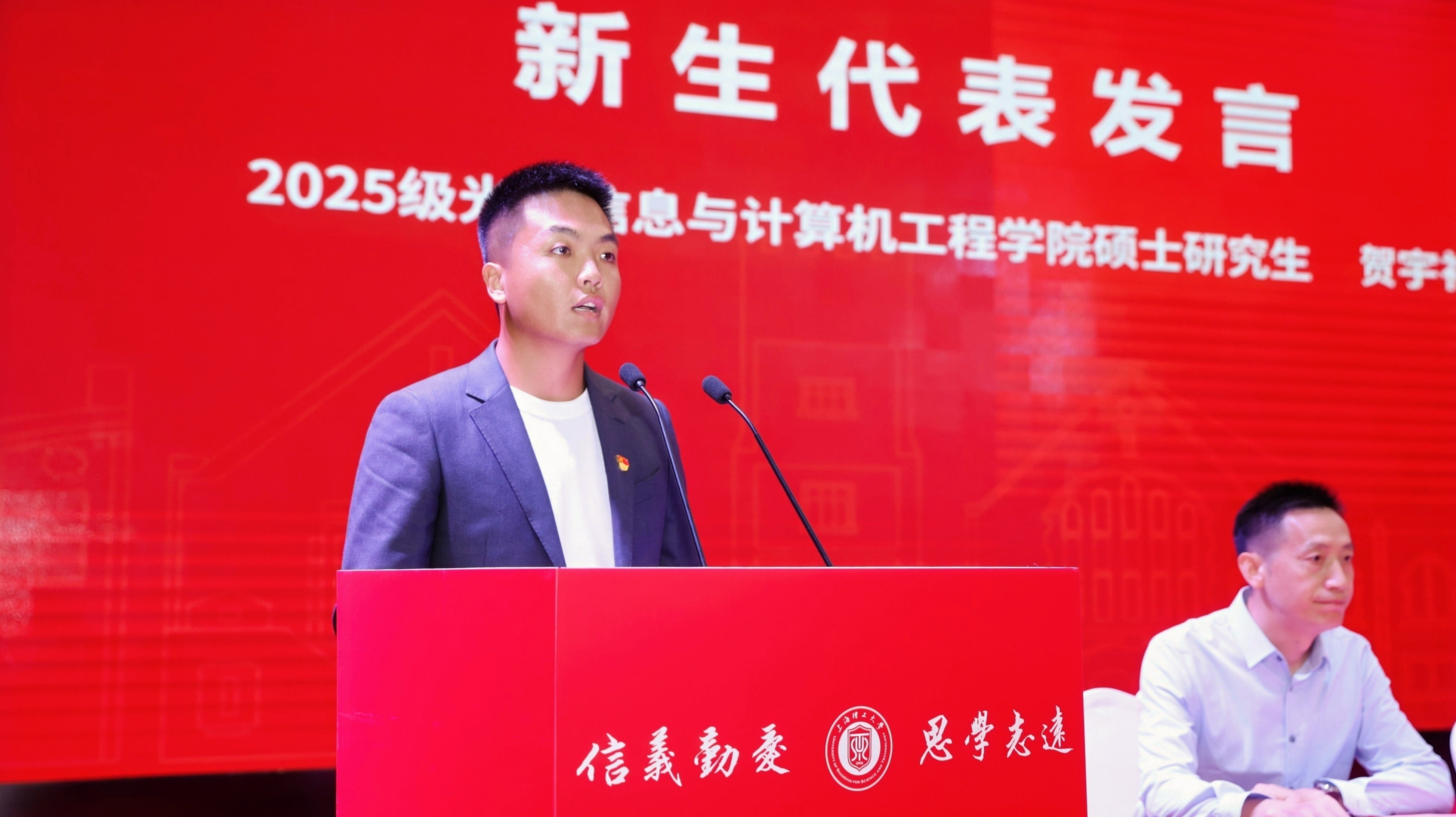 作为2025级研究生新生代表,来自光电信息与计算机工程学院的硕士研究生新生贺宇祥结合自己参军报国的经历,阐述个人成长与国家发展的紧密联系,提出青年学子应以科技为矛、以智慧为甲,以实际行动践行报国为民的时代使命。环境与建筑学院2022级能源与环境工程专业博士研究生龙宇琼作为老生代表发言,她分享自己的科研与成长体会的同时建议新生主动拓展学科边界,注重理论研究与现实应用的结合,在服务国家战略中实现学术价值,并珍视科研旅程中的合作情谊与日常收获。智能科技学院导师代表张启明教授在发言中向新生提出科研建议,强调要建立系统思维和跨界融合能力,理性面对科研中的“非理想”现实,通过持续迭代提升问题解决能力,并将个人研究方向与国家重大战略需求有机衔接。