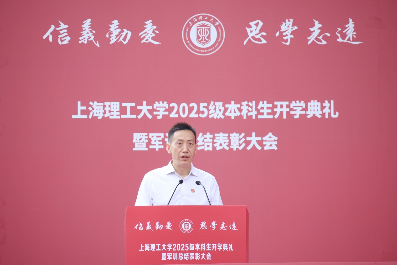 校长朱新远以“敢为人先,追求卓越”为题勉励新生。他向2025级新同学表示热烈欢迎,向辛劳付出的承训教官们表示衷心的感谢。适逢中国人民抗日战争暨世界反法西斯战争胜利80周年,朱新远在讲话中深情回顾了建国初期上理人不畏艰难、报国图强的办学历程。他勉励新同学一要秉持“敢探未知”的钻劲,筑牢卓越之基。充分利用学校搭建的成长支持体系,既要读好“有字之书”,打牢专业基础,又要读好“无字之书”,提升动手能力;二要怀抱“敢破边界”的闯劲,拓展卓越之界。面对社会发展的时代背景,要敢于打破边界,跨界融合,激活创新动能;三要传承“勇担使命”的干劲,把握卓越之机。面临建功立业的人生际遇和国家所需,锚定产业痛点和行业前沿,以实际行动和家国情怀,实现自己的卓越价值。