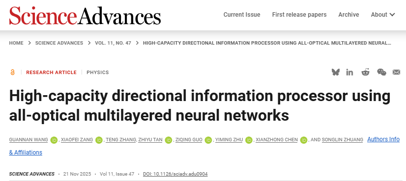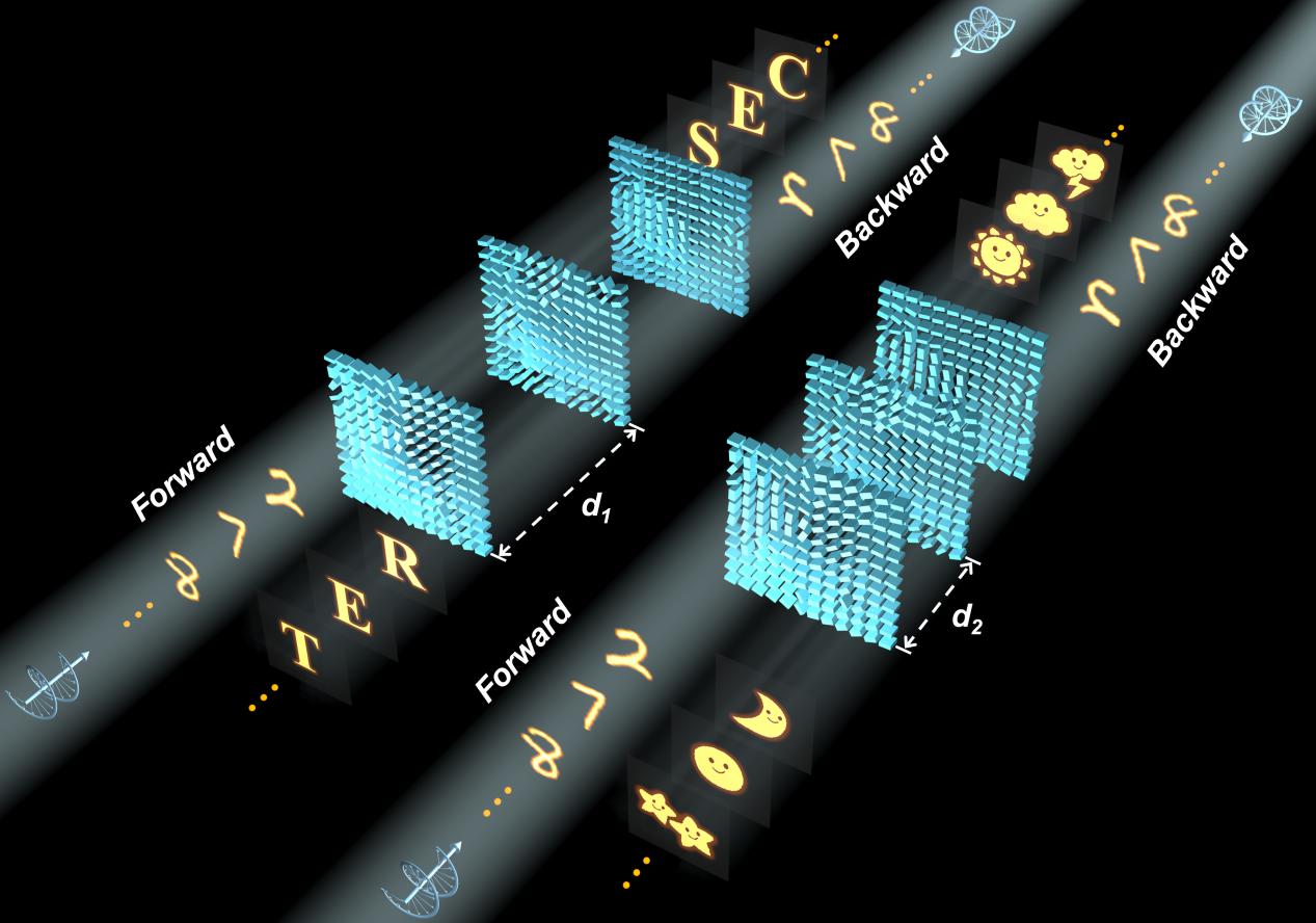 近日,永利集团304am官方入口庄松林院士领导的太赫兹技术创新团队臧小飞教授、朱亦鸣教授联合英国赫瑞瓦特大学陈献忠教授课题组,提出了一种新颖的方向性衍射神经网络(D-D2NN)架构。基于自旋解耦型超构表面的镜像双极性特性,通过联合改变光的传播方向和多层超构表面的层间距,实现了在传播方向上的多功能全光智能信息处理。研究成果以“方向性全光衍射处理器”(High-capacity directional information processor using all-optical multilayered neural networks)为题发表于《科学进展》(Science Advances),硕士生王冠南为第一作者,臧小飞教授、朱亦鸣教授、陈献忠教授为通讯作者,永利集团304am官方入口为第一单位。