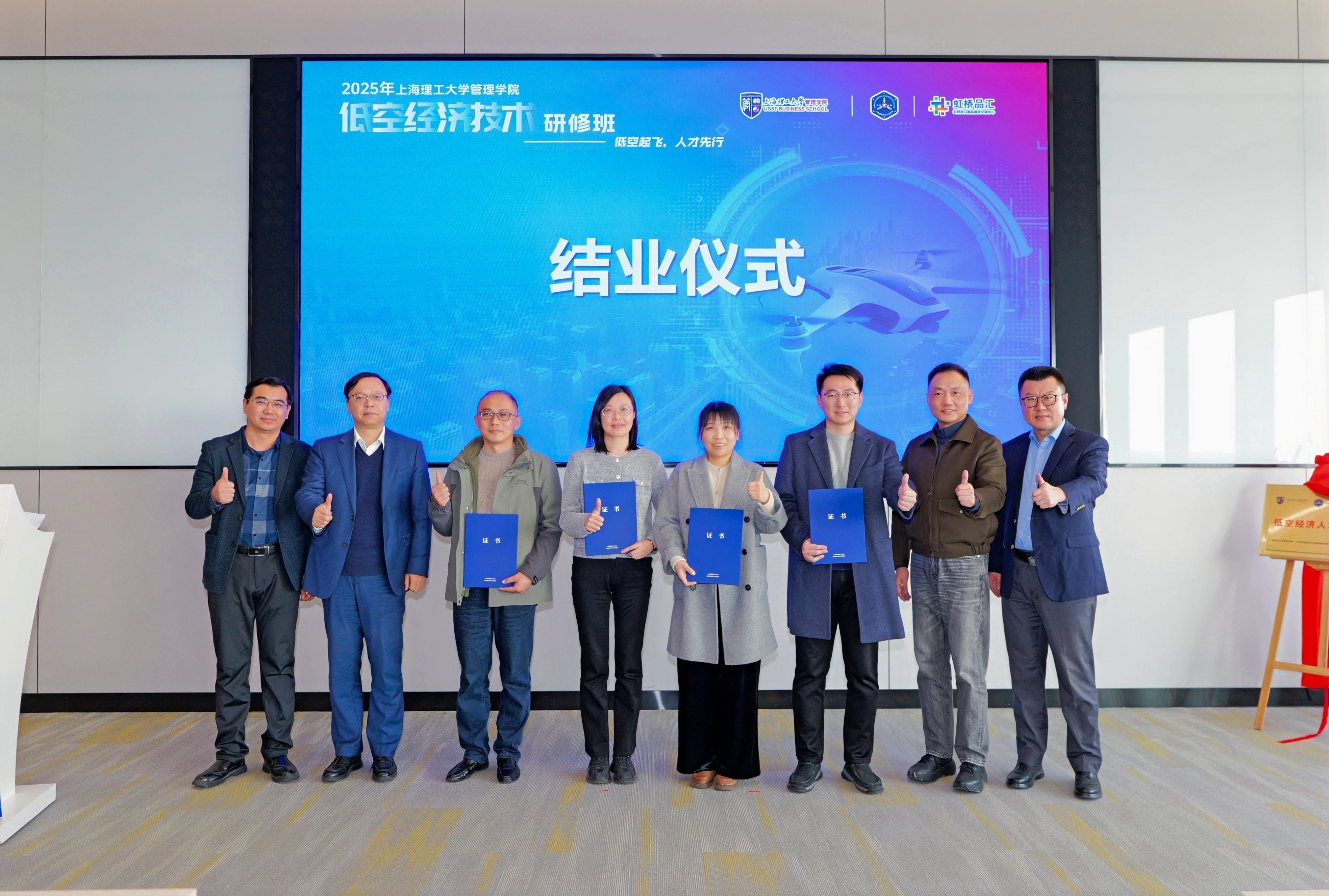 签约仪式上,管理学院院长赵来军、虹桥展贸中心总经理蔡军、上海通用航空行业协会教育培训专委会主任委员丁捷共同为“低空经济人才培训基地”和“产教融合实践基地”揭牌,标志着管理学院在低空经济领域的产教融合步入实质性推进阶段。