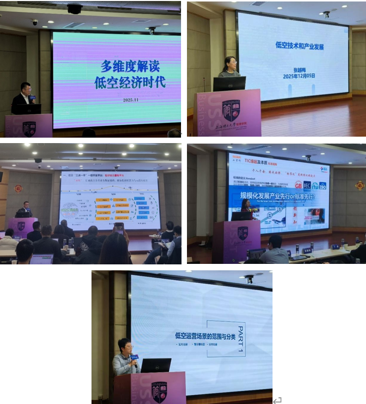随后为期一天的校内培训内容充实、精彩纷呈。课程围绕“低空经济通识”“低空科学技术发展图谱”“低空经济产业链剖析”“标准化研究”以及“运营场景应用”等核心议题展开,特邀南京航空航天大学博导张越梅、副教授李满,以及来自行业领军企业的专家丁捷、叶琼瑜、鲍冠生等资深行业专家进行深度授课与分享。与会教师就技术趋势、产业链关键环节及人才培养路径与嘉宾热烈互动,为教学科研积累了产业洞察。
