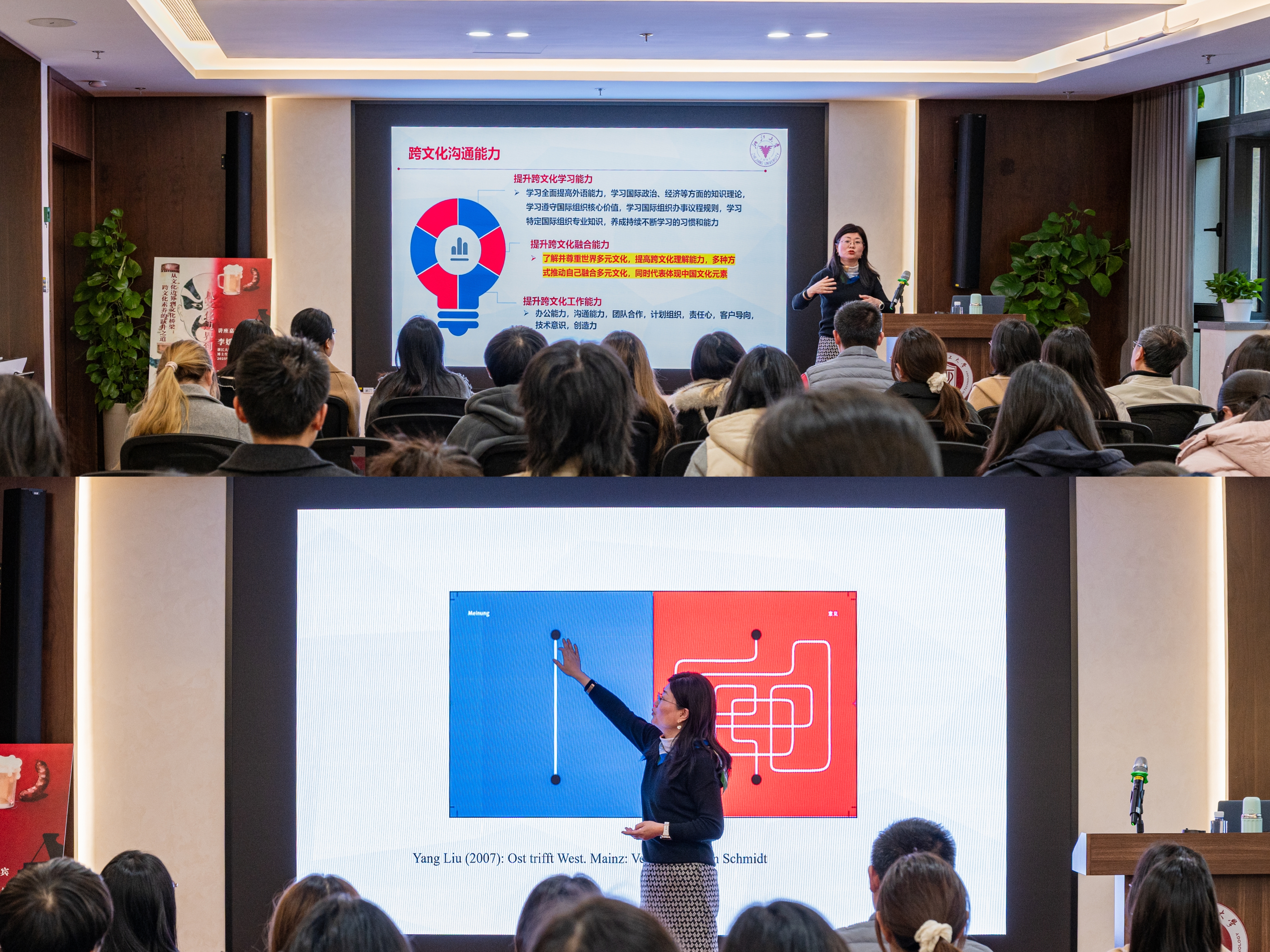 李媛教授以个人学术历程为引分享了自1989年与德语结缘至今的思考与实践。她通过“松鹤延年”画卷、“冰山模型”“洋葱模型”等作理论阐释,以情景模拟、广告对比和案例讨论为载体与学生开展交流互动。讲座尾声,李媛教授带领全体观众进行了一场“跨文化沟通身心操”,以肢体语言生动形象隐喻沟通姿态。