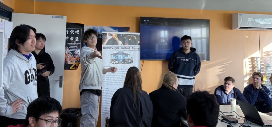 复兴路校区图书馆,作为校园一大亮点,为普鲁士风格的历史保护建筑,许多同学为其精美的建筑设计所惊叹,并在一楼的“1195咖啡馆”短暂休憩,享用咖啡、交流感想。教学楼四楼的创新领导力中心——“RoboVigor”机器人赛队活动室,是中英学子日常创新学习的场所。一进门,国际生们便被眼前丰富的器材与设备所震撼。团队负责同学为国际生们系统介绍赛队概况、机器人的设计与原理、实战经验与备赛策略分享、全真模拟软件分析等。国际生们通过亲手操作,体验与RoboVigor自主研发机器人互动的乐趣。