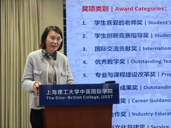 李妍宣读中英国际学院2025年度“优秀员工”表彰决定。本年度共设立九大荣誉奖项,涵盖“学生喜爱的老师奖”“学生创新竞赛指导奖”“就业指导奖”“国际交流贡献奖”等,旨在表彰在教育教学、科研创新、校企合作、国际交流、校园文化等领域作出突出贡献的先进个人。她号召全体教职工以先进为榜样,发扬敬业奉献精神,在探索教育改革新路径中勇担使命。