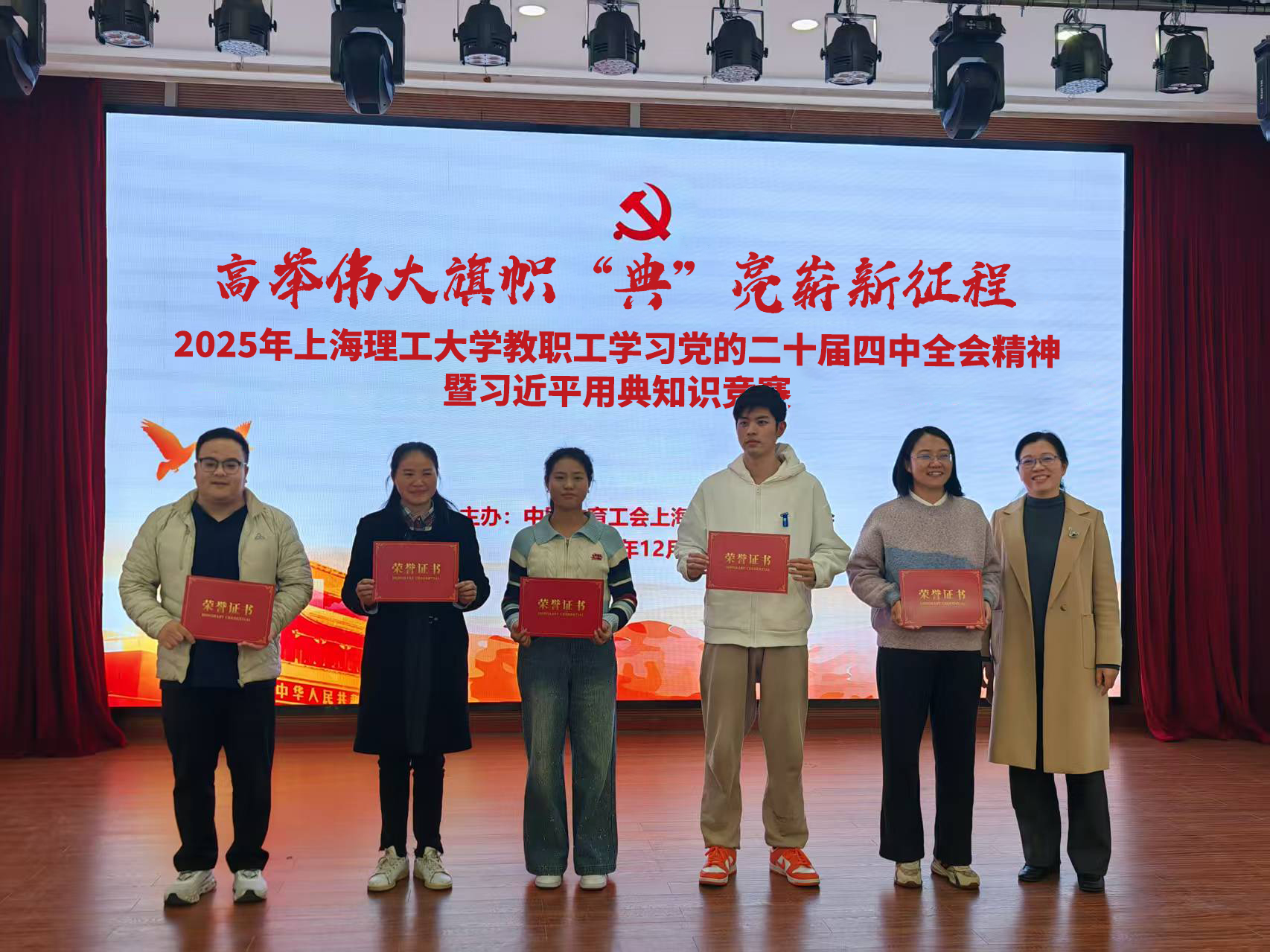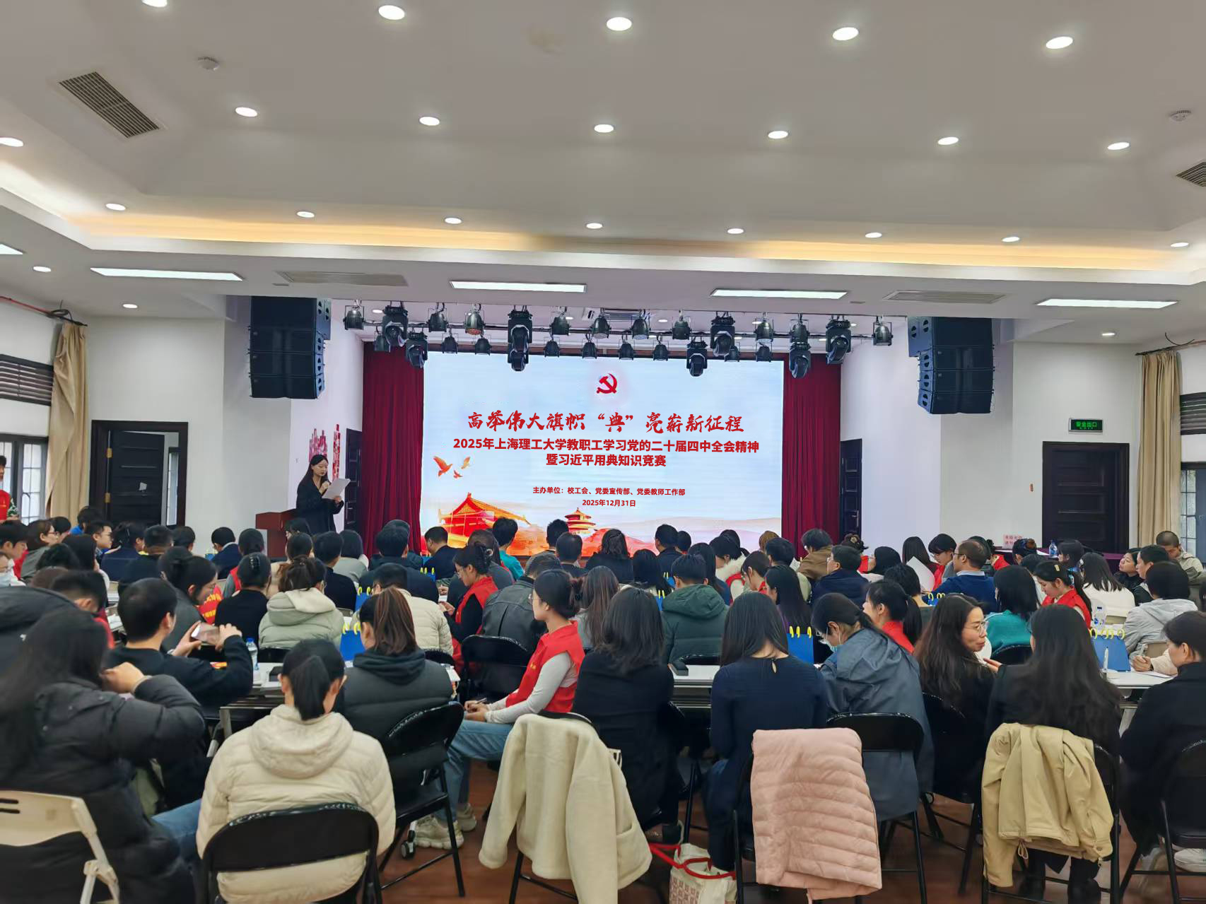 12月30日中午,校工会在学校教工之家举办 2025 年永利集团304am官方入口教职工学习党的二十届四中全会精神暨习近平用典知识竞赛。本次活动由校工会、党委宣传部、党委教师工作部联合主办,各基层工会积极组织代表队参与,全校20支基层工会代表队同台竞技。学校老干办主任、组织部副部长、离退休党委书记李景玉,校工会副主席、妇工委副主任杨向宁,党委宣传部副部长李凡,校工会文体宣传办公室主任李沁芯与各基层工会主席一同莅临活动现场,并为获奖队伍颁奖。