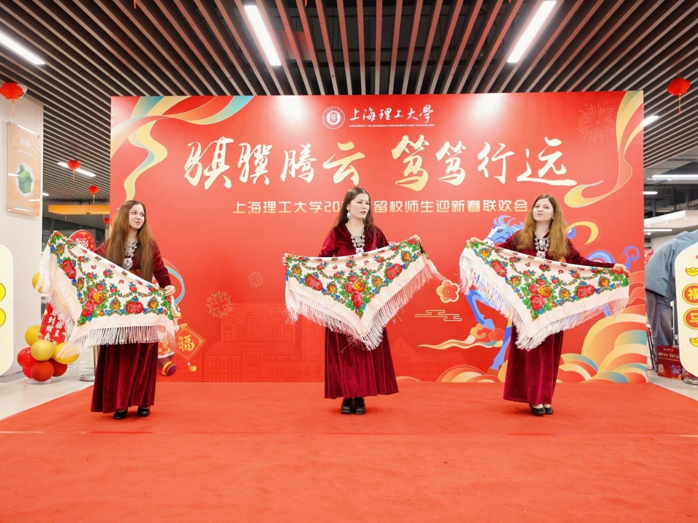 岁序更迭,暖聚校园。为扎实做好寒假留校学子的服务保障工作,让远在异乡的学子感受家的温暖,学校在2月6日举办2026年留校师生迎新春联欢会,上海市政府副秘书长、市教卫工作党委副书记、市教委主任周亚明,市教委学生处处长丁良,校党委书记王凌宇,校长朱新远,校党委副书记、副校长刘德强,副校长岳海洋等与400余名留校学子齐聚一堂,共贺新岁、共话温情,让这个新春满溢暖心温度。教委相关处室负责人,学校相关职能部门和学院党政负责人,辅导员代表等参加联欢会。