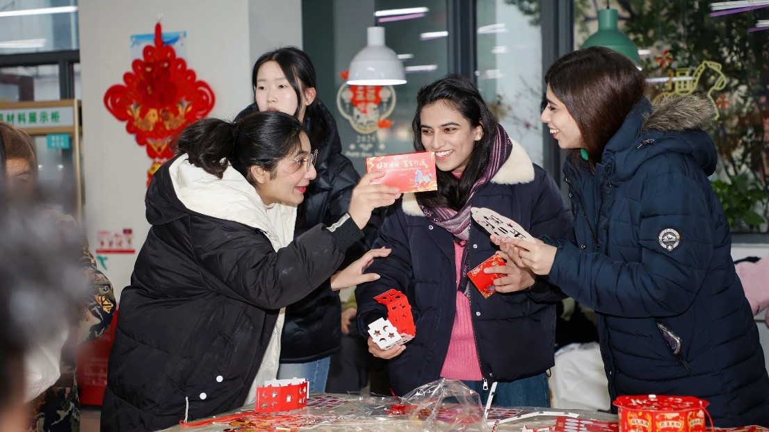 现场红灯笼高挂、福字点缀,猜灯谜、做窗花、投壶、写春联等经典项目依次铺开。学子们或凝神解谜、或巧手剪窗花、或趣味投壶互动、或挥毫写春联,将新春的美好期许凝于指尖、融于笔墨。不少国际生也主动加入,在亲身体验中探寻中国春节的文化底蕴,现场处处洋溢着团圆祥和的节日气息。
