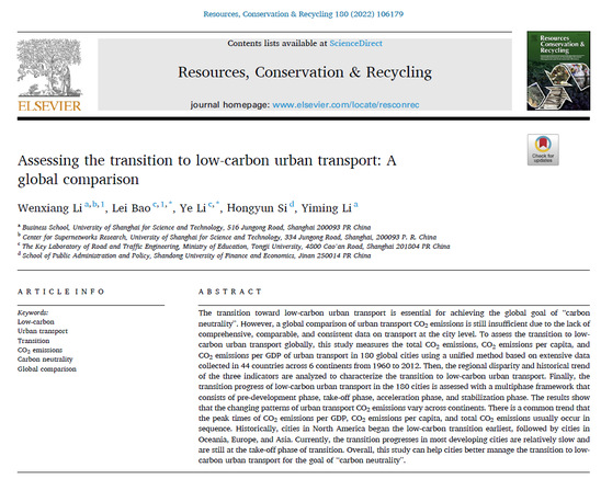 近日,管理学院青年教师李文翔在国际权威期刊Resources, Conservation Recycling(中科院一区,Top期刊,IF=10.204)上发表论文《城市交通低碳转型发展评估:全球对比研究》(Assessing the transition to low-carbon urban transport: A global comparison)。该论文以永利集团304am官方入口管理学院为第一单位,李文翔为第一作者,同济大学包磊博士、李晔教授为共同通讯作者。在我国“碳达峰、碳中和”战略目标下,城市交通低碳转型发展迫在眉睫。然而,由于缺少全球统一的测算与评价标准,全球不同城市交通碳排放特征和转型阶段尚不明晰。因此,该论文基于统一统计口径的全球城市数据,对比分析了全球180个城市不同时期的交通碳排放空间差异与转型特征,并根据碳达峰时间率先提出了四阶段转型评价框架,以评估各城市交通低碳转型进展。研究结果发现,全球不同地区的城市交通低碳转型开始时间由先至后依次是:北美洲、大洋洲、欧洲、亚洲发达国家(地区)以及其他发展中国家的城市。欧美发达国家的主要城市已实现交通碳达峰,并进入转型稳定期,而中