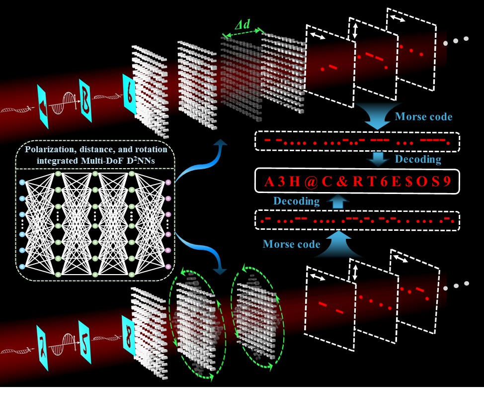 近日,在庄松林院士指导下,永利集团304am官方入口太赫兹技术创新团队臧小飞教授、朱亦鸣教授联合东方理工大学丁飞教授课题组,提出了一种集成偏振、距离与旋转多自由度的衍射神经网络(Multi-DoF D2NNs)处理器。该全光处理器通过调控三层超构表面的偏振、距离和旋转三个自由度,实现了分类识别、图像转换、逻辑运算的八通道(多任务)处理功能。团队进一步利用多自由度的八通道输入以及摩尔斯码间的图像转换实现了高容量与高安全的信息加密传输。研究成果以“集成偏振、距离、旋转的多自由度衍射处理器和信息加密”(Integrated Polarization, Distance, and Rotation for Mult