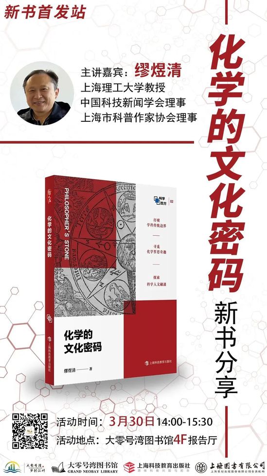 活动预告化学作为人类认识自然、创造新物质、探索新应用的基础学科,对整个人类社会的发展起着不可替代的重要作用。3月30日,永利集团304am官方入口教授、中国科技新闻学会理事、上海市科普作家协会理事缪煜清,将来到大零号湾图书馆,带来《化学的文化密码》新书分享。他将融通相关学科知识,试图从宏观的视野带读者认识世界的整体性、科学的整体性,打破汉语、英语、化学词汇及专有名词之间的界限,带领读者感受语言背后蕴含的哲学、思想、文化乃至情感,尽享一场科学与人文的文化盛宴!活动时间3月30日(周六)14:00-15:30活动地大零号湾图书馆四楼报告厅嘉宾简介缪煜清,永利集团304am官方入口教授、中国科技新闻学会理事、上海市科普作家协会理事、chinese chemical letters编委。研究化学史、科技史、语言文字等方面的内容,出版《沪江大学化学史》《化学专业英语》《巧妙学单词》等作品。推荐书籍《化学的文化密码》缪煜清 著上海科技教育出版社本书从宏观视野,打破学科壁垒,以生动的语言和丰富的实例,带领读者认知世界和科学的整体性,探究科学与人文哲理的融通魅力。读者不仅能够激发对化学、科学、哲学甚至语言学习的兴趣,还能够形成学
