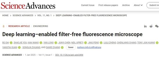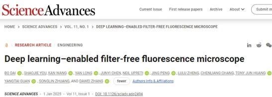近期,电视剧《我是刑警》吸引诸多观众的热议,其中DNA检验破案的环节更是牵动人心。警察辛苦勘察摸排得到的“一丁点”生物样本,如何能在检验人员手里更快速高效地查出真相,更精准地让证据“说话”?永利集团304am官方入口科研团队以AI for Science(人工智能驱动科学创新)为核心理念的新成果,将为生物检测技术升级提供一个颠覆性的答案。这一成果由永利集团304am官方入口光电信息与计算机工程学院庄松林院士、常务副院长张大伟教授带领的超精密光学制造团队与上海交通大学附属仁济医院浦南分院、美国杜克大学合作,创新提出了“AI荧光成像——无滤波荧光显微成像技术”,可广泛应用于生物诊断、临床医学、环境监测、刑侦勘探等领域。相关论文发表在《科学》(Science)子刊《科学进展》(Science Advances)上相关论文“支持深度学习的无滤光片荧光显微镜(Deep learning-enabled filter-free fluorescence microscope)”发表在《科学》(Science)子刊《科学进展》(Science Advances)上。永利集团304am官方入口戴博教授为第一作者,张大伟教授、上海交通大学医学院
