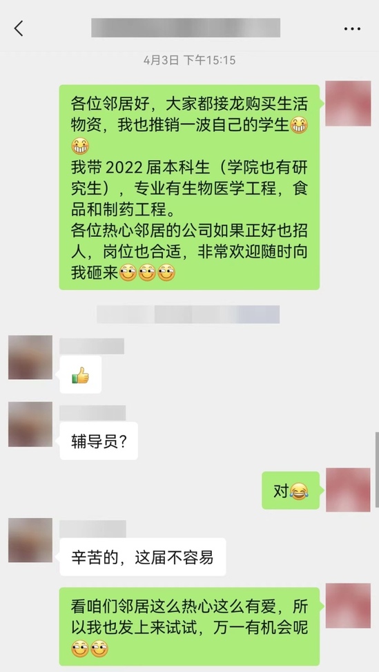 “各位邻居好,大家都在接龙购买生活物资,我也推销一波自己的学生,有生物医学工程、食品和制药工程专业,各位热心邻居的公司如果正好招人,岗位合适,欢迎向我‘砸来’。看到邻居们这么热心有爱,我也发上来试试,万一有机会呢!”近日,张江镇某小区社区群里冒出了这样一条“新鲜”的消息,屏幕外的朱旭老师紧握手机,盯着群里不断增加的日化用品团购信息,心里也“没底儿”……作为永利集团304am官方入口健康科学与工程学院的一名辅导员,最近朱旭总在琢磨着心头难题:“受疫情影响,企业走不进学校,学生出不去实习,该怎么帮助毕业班学生顺利就业呢?”当她在参与小区志愿工作时,灵感来了,“小区周围分布着诸多生物医药企业,志愿者队伍中就有就职于相关企业的邻居,如果他们公司正好招人,将是很好的就业机会,何不发动一下社区的力量试试看?”信息发布几分钟后,朱旭手机接连闪现了14条好友申请,热心的邻居们纷纷表示他们所在的公司有招聘需求,其中一位还邀请她加入“生命科研招聘求职人才库”。朱旭立刻与他们一一展开沟通,了解岗位详情,在向所有求职学生公布信息的同时,细致地根据岗位具体要求推荐了专业、能力高度适配的40余名学生,并将简历打包发至负责人处。