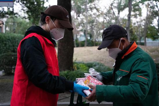 “今日早晨受冷空气影响,上海气温开始明显下降,市区最低气温跌至2℃,郊区零下2℃到0℃,有薄冰……”12月22日是冬至日,迎着凛冽的寒风,一群身着红马甲的研究生志愿者汇聚到军工路主校区南北区门口,开启他们致敬基层劳动者、传递温暖爱心的志愿服务活动。凌晨五点半,志愿者团队准时集结完毕,配齐物资准备出发。他们分为两支小队,沿着各自的路线到每个后勤岗位上,为门卫小哥、宿管阿姨、保洁工人等一直默默奉献的后勤工作者送上精心准备的温暖礼物。“今天是传统节日冬至,送您一双手套。这个手套是可触屏的,你们带着不妨碍刷卡。”在志愿者的细心讲解下,保安们一一接过手套,脸上洋溢着被关心的喜悦。“太感谢你们了,因为疫情,大部分同学都回家了,没想到这个时候你们还给我们送温暖,你们也要照顾好自己。”收到精心准备的御寒礼物,保洁阿姨连连道谢。“参加完凌晨五点半活动后,我们一边送温暖,一边也是被感动、受教育。学校基层人员的工作并不起眼,但却是学校有序运行、学生如常生活的重要保障。平凡的岗位,不平凡的价值,值得我们每一位学生的敬重,也要向他们学习吃苦耐劳、甘于奉献的劳动精神。”来自管理学院的史文凯同学在参加完活动后分享了